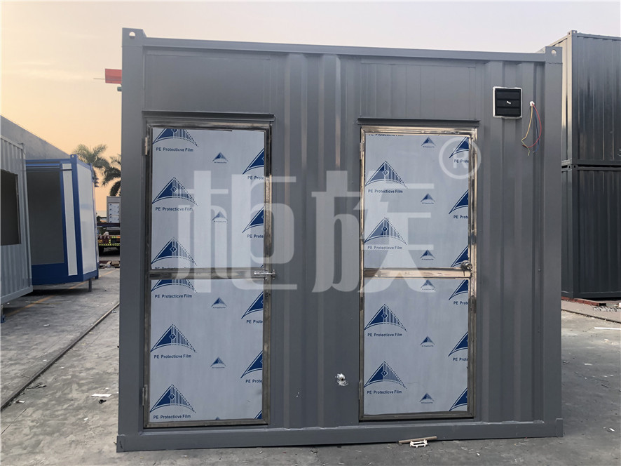 箱體用材:鍍鋅方管框架、A級(jí)大波紋夾芯墻板、不銹鋼門、鋁花紋地板。